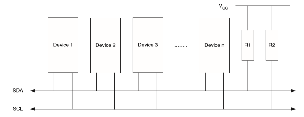 각 버스선 마다 pull-up저항이 연결되어 있으며, 마스터와 슬레이브 동작을 동시에 지원한다.