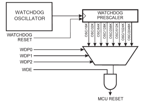 prescaler를 변경할 경우 WDCE와 WDE를 1로 세트하고 4클록 내에 WDCE를 클리어 하고 WDP에 값을 쓴다.